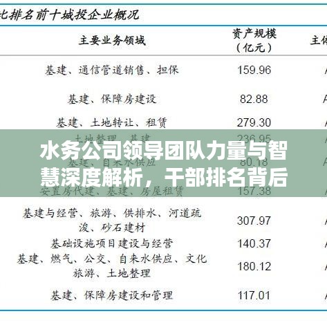 作为博客站长,今天我们将深入探讨水务公司干部排名这一话题,在快速发展的现代社会,水务公司作为城市基础设施的重要组成部分,其领导团队的能力和智慧对于公司的运营和发展起着至关重要的作用,我们将从多个角度探究水务公司干部排名背后的意义。