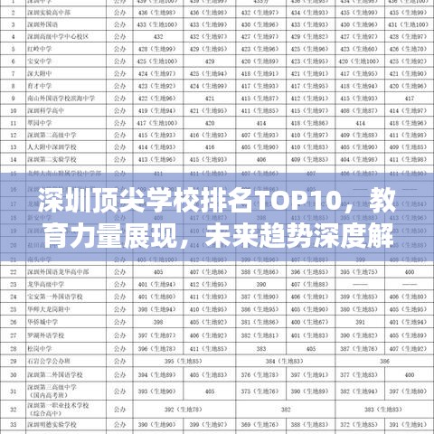 作为博客站长,今天我将为您解读深圳地区的高分学校排名前十名的情况,随着教育的不断进步与发展,深圳的教育事业也取得了显著的成绩,本文将为您详细介绍这些学校的优势以及未来教育的发展趋势。
