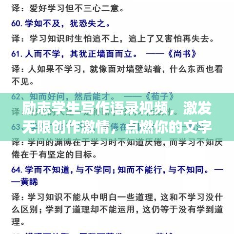 励志学生写作语录视频是学生们在创作路上的宝贵资源,通过观看这些视频,我们不仅能够获得灵感和动力,还能学到很多实用的写作技巧和方法,希望这些视频能够陪伴你度过每一个艰难时刻,激发你的创作激情,让你在写作的道路上越走越远。