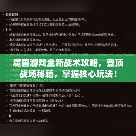 魔兽世界作为一款经典的游戏,吸引了无数玩家的热爱,随着版本的更新和新英雄的加入,魔兽世界的玩法也在不断丰富,为了在游戏中取得更好的成绩,掌握最新的打法攻略至关重要,本文将为您详细介绍魔兽最新打法攻略图,让您轻松登顶战场!