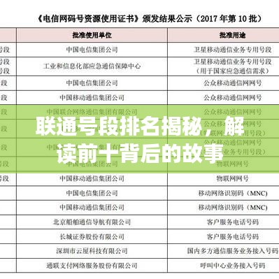 通过对联通号段排名前十名的解读,我们可以发现每个号段背后都有其独特的故事和原因,这些号段的排名不仅反映了用户规模和知名度,还体现了联通的发展战略和业务布局,希望本文能够帮助大家更好地了解联通号段的概况和排名背后的故事,随着通信技术的不断发展,我们期待联通能够推出更多优质的号段,满足用户的需求。